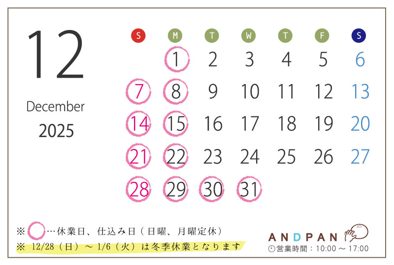 12月28日(日)~1月6日(火)まで冬季休業となります。